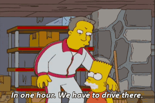 In one hour. We have to drive there. No talking on the way. It'll hurt the drama. - Can I just... - Shh. Drama.