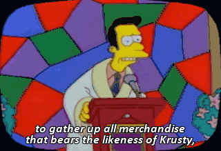 to gather up all merchandise that bears the likeness of Krusty, that clown prince of corruption, and join me in a public burning ! So, is Krusty the Clown about to trade in his baggy pants...