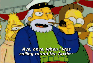 Aye, once, when I was sailing round the Arctic-- Shut up, you. Take one last look at the sun, Springfield.