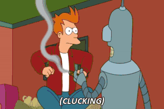 (CLUCKING) Stop pecking me! Hey! (YELLS) Leggo my eggo, crabbo! Stop it, Fry. That's sexual harassment!