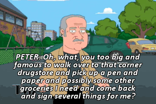 PETER: Oh, what, you too big and famous to walk over to that corner drugstore and pick up a pen and paper and possibly some other groceries I need and come back and sign several things for me?