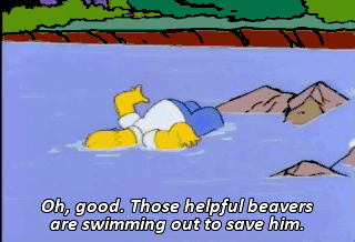Oh, good. Those helpful beavers are swimming out to save him. Oh, no. They're biting him and stealing his pants. Good lord! He'll be sucked into the turbine.