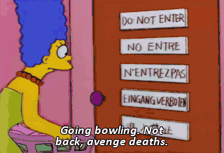 Going bowling. Not back, avenge deaths. Why do you have so many bowling balls? Oh! I'm not gonna lie to you, Marge. So long!
