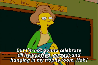 But I'm not gonna celebrate till he's gaffed, gutted, and hanging in my trophy room. Hah! We have the same dream, ma'am.