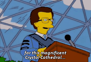 for this magnificent Crystal Cathedral... which allows us to look out... upon his wondrous creation. Now quickly! Gaze down at God's fabulous parquet floor. Eyes on the floor. Still on the floor.