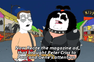 Now Recite the magazine ad that brought Peter Criss to Paul and Gene's attention. "Drummer willing to do anything to make it." Rolling Stone, October, 1972. Exemplary. Rock and roll.