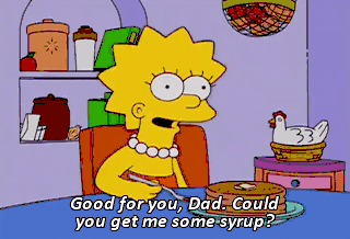 Good for you, Dad. Could you get me some syrup? Mmm. Hmm. You see? Before I probably would've driven to the syrup.