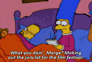 What you doin', Marge? Making out the jury list for the film festival. Mayor Quimby, Krusty, jay. Marge, do you respect my intelligence? - Yes. - Okay. Wait a minute. Why did it take you so long to say yes?