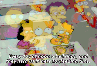 Every day at noon a bell rings, and they herd us in here for feeding time.