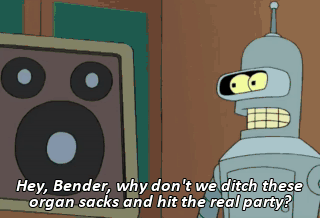 Hey, Bender, why don't we ditch these organ sacks and hit the real party? Count me in. I'm going to drink till I reboot. Hey, what kind of party is this? There's no booze and only one hooker.