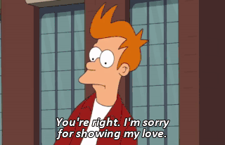 You're right. I'm sorry for showing my love. (SIGHS) Okay. Fine. Here, take my hand.