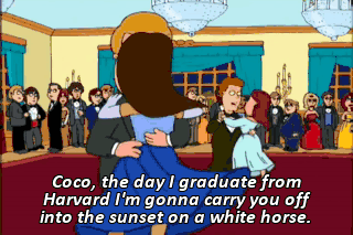 Coco, the day I graduate from Harvard I'm gonna carry you off into the sunset on a white horse. It better be a stretch horse with leather seats and a chauffeur. Isn't she a bit of terrific?