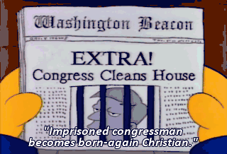 "Imprisoned congressman becomes born-again Christian." I can't believe it. The system works.