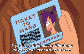 Fry, this is the most noble thing anyone has ever done for me. Wait, Fry? I'm a lot of people, but I'm not Fry. (LAUGHS) Oh, no!