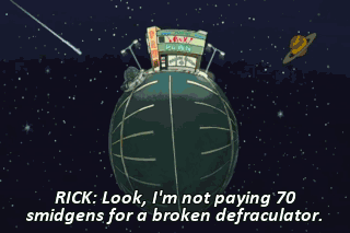 RICK: Look, I'm not paying 70 smidgens for a broken defraculator.