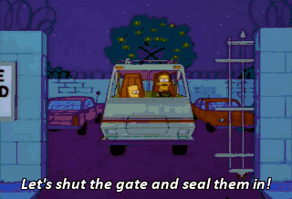 Let's shut the gate and seal them in! Gun it, Flanders! It won't start. Something's draining the battery.