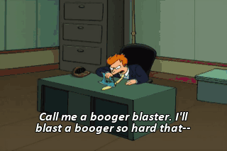 Call me a booger blaster. I'll blast a booger so hard that-- Fry, we're worried about Planet Express.