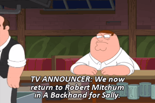 TV ANNOUNCER: We now return to Robert Mitchum in A Backhand for Sally.