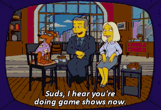 Suds, I hear you're doing game shows now. Gelman, roll the clip! Things you buy in a dime store! Uh, famous first ladies! Things your toothbrush might say! Whoo-hoo!