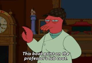 This boot print on the professor's lab coat. Uh... couldn't be me. I never wear boots. See? Eww. What smells like boot feet? This is preposterous. Obviously, the murderer is--
