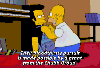 Their bloodthirsty pursuit is made possible by a grant from the Chubb Group. Give us the money! Elmo knows where you live.