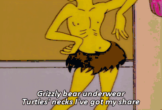 Grizzly bear underwear Turtles' necks I've got my share Beret of poodle on my noodle it shall rest