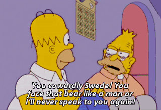 You cowardly Swede! You face that bear like a man or I'll never speak to you again!