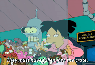 They must have fallen into the crate. Aw, Leela's going to kill me. Nah. She'll probably make me do it. Mister could you please get those keys out for me? What do I look like, a guy who's not lazy?