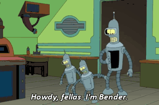 Howdy, fellas. I'm Bender. Go to hell, old man! I like your attitude. Let's party. But first, fold these two sweaters. BOTH: I'm sorry, do you see a robot in this room named "Folder"?