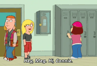 Hey, Meg. Hi, Connie. I can't fit all my books in my locker. Can I put the rest of them on your ginormous ass? (LAUGHING) Hey, Connie, hi. Peter Griffin, Meg's father.