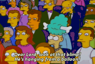 Dear Lord, look at that blimp! He's hanging from a balloon! Marge, uh, can we not land here? Honey? Baby doll?