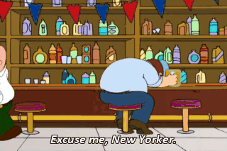 Excuse me, New Yorker. I think you're in my seat, and I had sex with your mother last night. Peter, are you crazy? What did you say? Oh, About the seat, or about my plowing your father's wife?