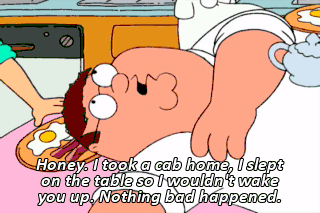 Honey. I took a cab home, I slept on the table so I wouldn't wake you up. Nothing bad happened.