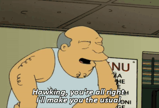 Hawking, you're all right. I'll make you the usual. Hey, Stephen Hawking. Aren't you that physicist that invented gravity?
