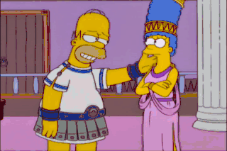 Oh, I can't stay mad at you. Mmm-mmm! Aw! Brave Odysseus, it's been 20 long years. Regale me with tales of your adventures. Quit suffocating me. I'm going to Moe's. Yeesh!