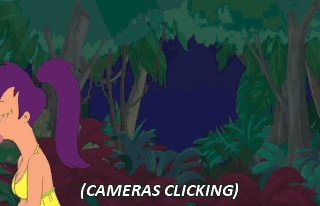 (CAMERAS CLICKING) (ALL GASP) Oh, your God! Fry and Leela are in a zoo! Shh! Oh, sorry.