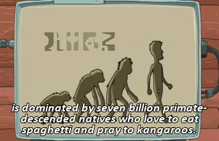 is dominated by seven billion primate-descended natives who love to eat spaghetti and pray to kangaroos.