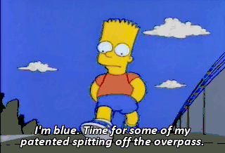 I'm blue. Time for some of my patented spitting off the overpass. Aw, man! Lise, everyone in town is acting like me. So why does it suck?