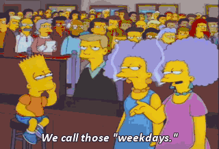 We call those "weekdays." Good one. At least I'm not stuck at the cracker factory like Milhouse. Wow! Ever wonder how crackers get salted? Have I!