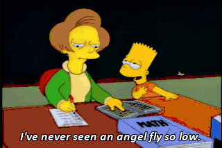 I've never seen an angel fly so low. Forget it, short pants. Mrs. Krabappel, if I don't get at least a "C" average, I can't go to Kamp Krusty! Have a "D"-lightful summer! Five!