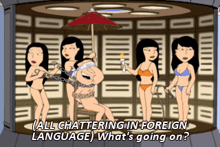 (ALL CHATTERING IN FOREIGN LANGUAGE) What's going on? (ALL GIGGLING) Don't you laugh at it.
