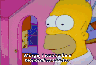 Marge, I wanna be a monorail conductor. Homer, no. It's my lifelong dream. Your lifelong dream was to run out on the field during a baseball game, and you did it last year, remember? Oh, yeah.