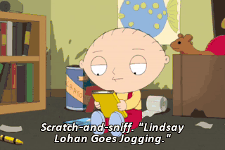 Scratch-and-sniff. "Lindsay Lohan Goes Jogging." (SCRATCHING) (SNIFFS) Oh, God! That's terrible! Oh, here's a pop-up book. "Tommy Lee Goes Boating."