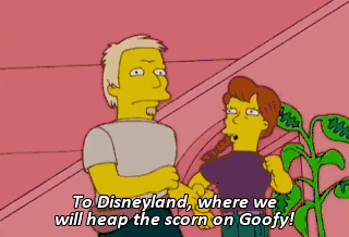 To Disneyland, where we will heap the scorn on Goofy! (ALL CLAMORING) Now everything's perfect again.
