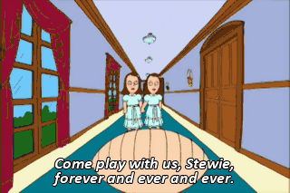 Come play with us, Stewie, forever and ever and ever. Yes. All work and no play makes Stewie a dull boy.