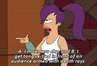 A: I'm camera shy, and B: I get tongue-tied in front of an audience armed with death rays. Plus, you don't really have the thighs for a miniskirt. Give me the script. Places, everyone!