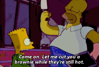 Come on. Let me cut you a brownie while they're still hot. Dad, I'm kind of edgy right now.