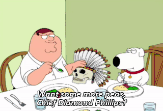 Want some more peas, Chief Diamond Phillips? Peter, I really think you should put that back where you found it. You know, Brian, I really don't think you should breast-feed the skull.