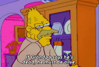 If Grandpa says he's dead, he must be alive. He is alive. He's wagging his tail. Dogs wag their tails for hours after they die.