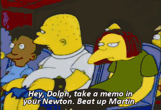 Hey, Dolph, take a memo in your Newton. Beat up Martin. Bah! Yeow! All right, first academic alert: Wiggum, Ralph. I won! I won!